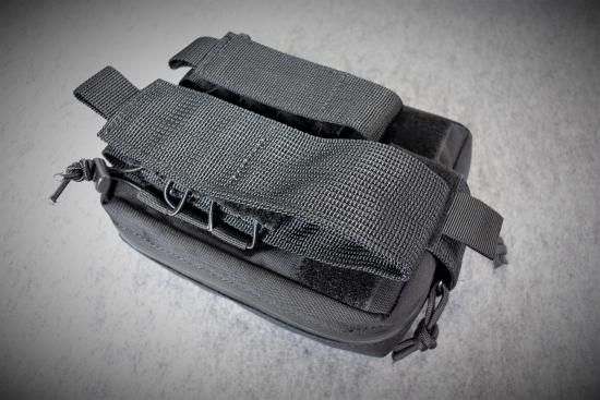 前面のポーチは止血帯とライト等用で、収納容量によって締め付け具合を細部調整可能。サバイバルゲーム用途ではもちろん収納するものに制限はありません。伸縮エラスティックバンドで内容物を固定できますので工夫次第で非常に便利なポーチとなります。